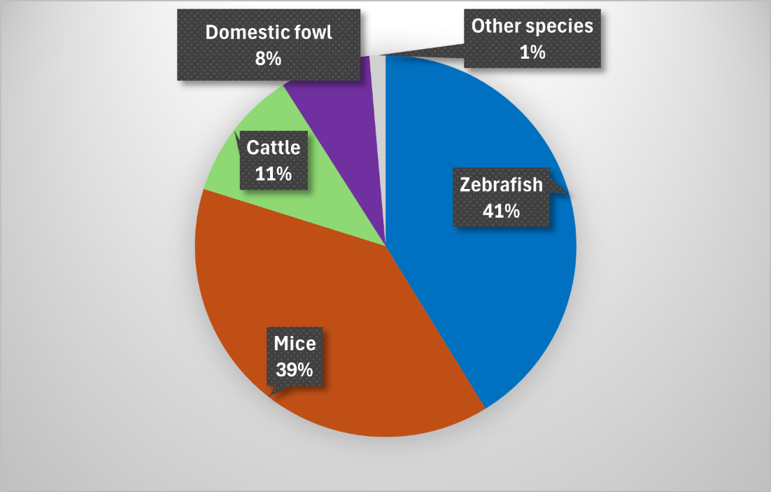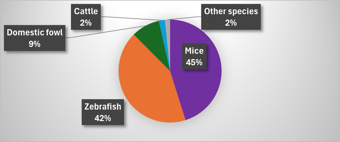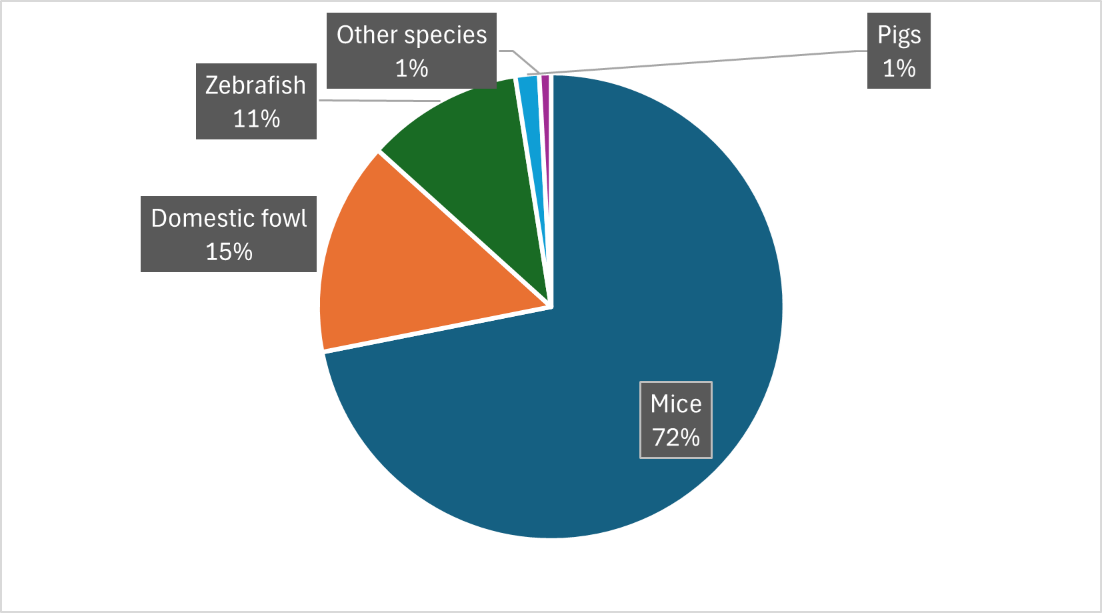 ‘Other species’ includes alpacas, dogs, sheep and pigs. These species each represent less than 1% of animals used and are grouped together in the chart for clarity. Full details are provided in the table above.