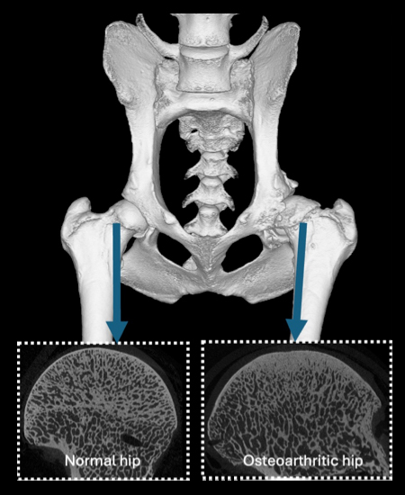 Conducting this research, the RVC team used ultra-high-resolution micro-computed tomography (CT) to map the entire femoral head (the ball of the hip joint) in three dimensions. They studied osteoarthritic tissues from dogs with osteoarthritis treated with total hip replacement surgery at the RVC’s Queen Mother Hospital for Animals. Previous research in human samples has only analysed localised small samples, whereas with analysis of the entire bone structure in 3D, the researchers identified that different areas of the femoral head simultaneously responded differently.